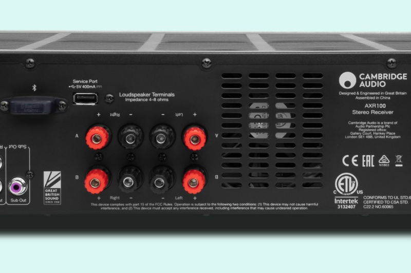 Cambridge Audio AXR100 có công suất khuếch đại lên tới 100 Watt, tích hợp bộ dò kênh FM/AM, kết nối Bluetooth, trang bị ngõ vào RCA, Phono và 3,5mm. Điểm khiến cho AXR100 trở nên độc đáo hơn các sản phẩm trong cùng tầm giá chính là khả năng xuất âm ra 2 cặp loa cùng lúc hoặc đấu bi-amp.