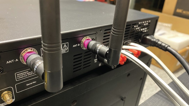 Amply có cấu tạo gồm 1 đầu thu đi cùng với 2 micro không dây. Đầu thu là tích hợp của vang số và cục đẩy công suất 2 kênh.