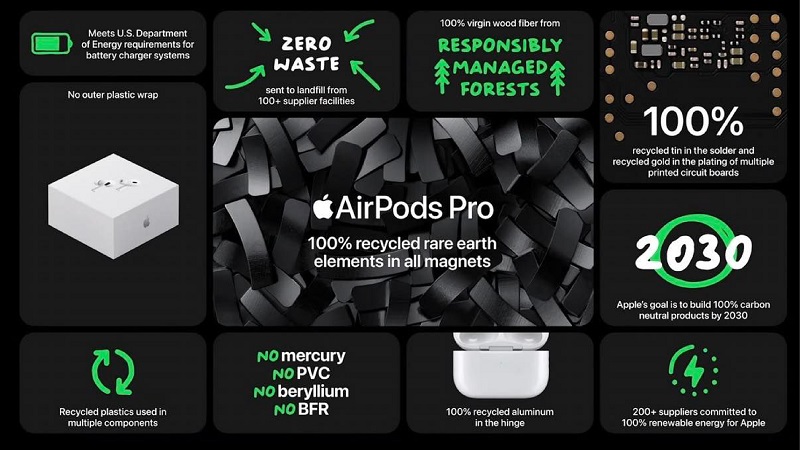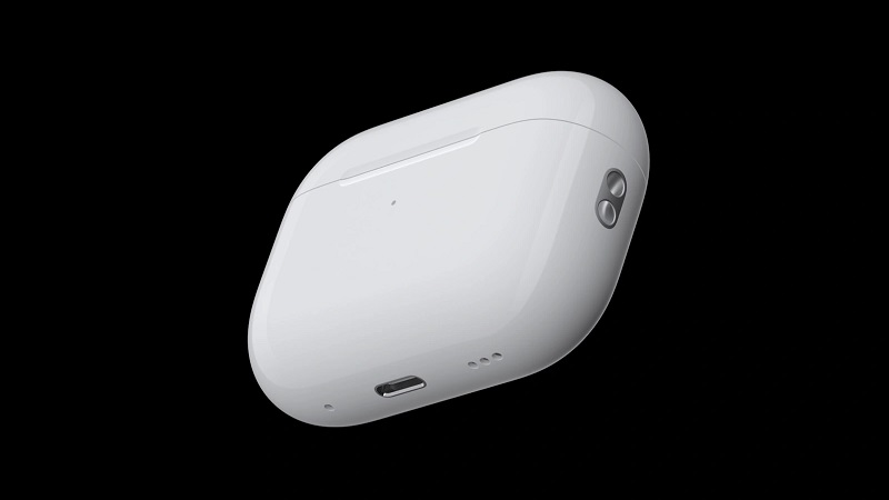 Về thiết kế hộp sạc, Apple sử dụng 100% nguyên vật liệu tái chế cho hộp sạc, với mục đích bảo vệ môi trường nên chất liệu này rất thân thiện với môi trường. Dù vậy, có một thay đổi nhỏ trong thiết kế AirPods Pro 2 đó chính là trang bị thêm loa ở cạnh dưới để người dùng có thể dễ dàng tìm kiếm thiết bị, định vị vị trí thông qua tính năng Find My.