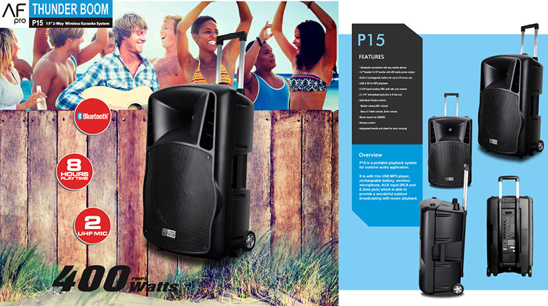 Công suất cực đại lên đến 400W, Audiofrog Pro-P15 cho bạn sử dụng thoải mái trong các hoạt động ngoài trời với chất lượng âm thanh ấn tượng. Loa trình diễn 2 đường tiếng có thiết kế bên ngoài cứng cáp với những đường nét sắc sảo, các góc cạnh mạnh mẽ, chắc chắn kết hợp cùng phần tay kéo nhôm chắc chắn và bánh xe linh hoạt, giúp tiện lợi khi di chuyển cũng như khi muốn đặt loa đứng cố định.