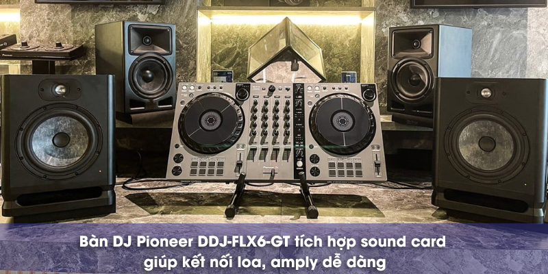 Bàn DJ Pioneer DDJ-FLX6-GT được trang bị sẵn sound card tích hợp. Nhờ đó bàn DJ có thể kết nối trực tiếp với amply hoặc loa thông qua một cáp RCA duy nhất. Ngoài ra bạn cũng có thể dễ dàng kết nối bàn DJ với máy tính qua cáp USB đi kèm trong sản phẩm.