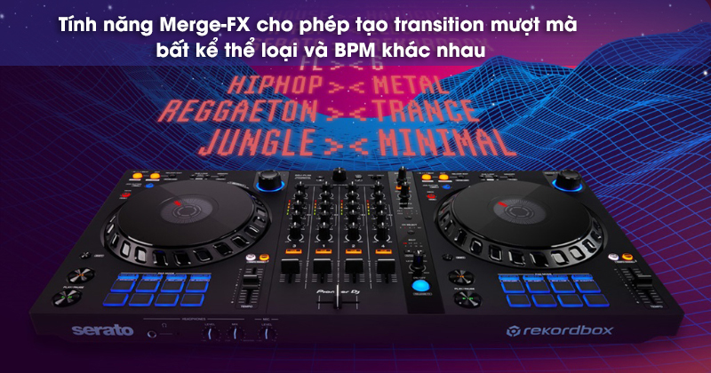 Merge FX là một tính năng hoàn toàn mới được giới thiệu trên mẫu Bàn DJ Pioneer DDJ-FLX6-GT. Tính năng này có khả năng chuyển đổi mượt mà giữa hai bản nhạc bất kể thể loại hay BPM khác nhau. Để sử dụng tính năng này bạn chỉ cần nhấn vào núm để bật hiệu ứng sau đó xoay núm để tăng giảm cường độ. Tính năng này đặc biệt phù hợp với các DJ thường chơi nhiều thể loại nhạc. Vì nó giúp bạn dễ dàng tạo ra các hiệu ứng transition ấn tượng.
