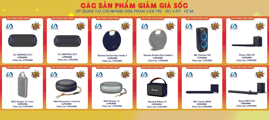 - Các sản phẩm bán chạy được deal giảm giá cực sốc như Harman Kardon Onyx studio 5; JBL Parrty box 100, B&O beoplay A1 các bạn tham khảo thêm các sản phẩm khác tại đây: https://dientulinhanh.com/collections/loa-dang-giam-gia