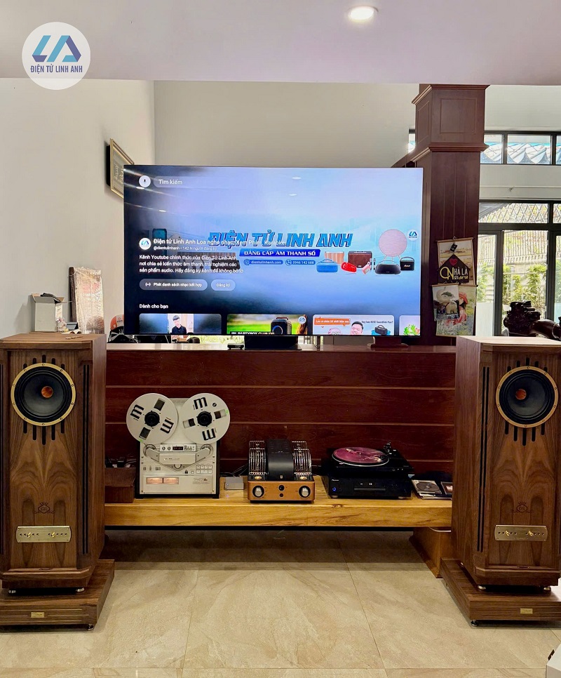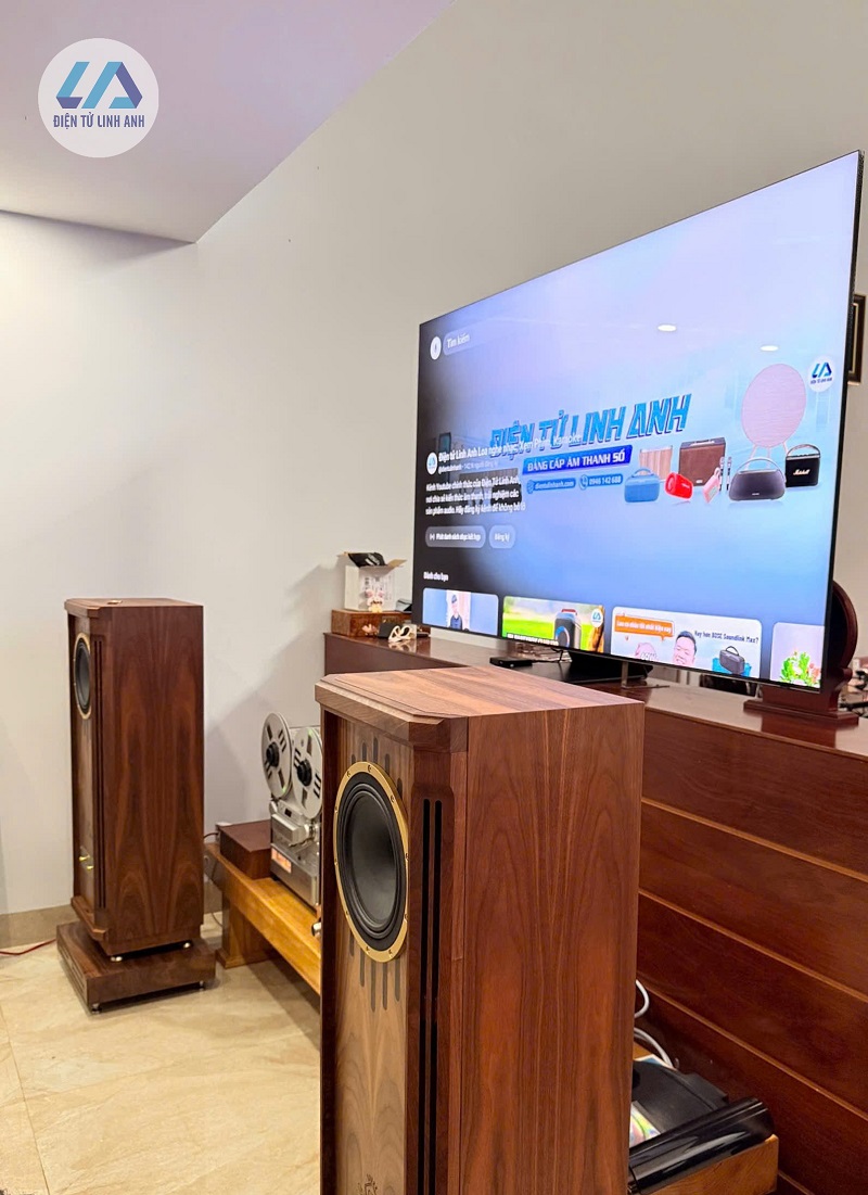 Tại công trình, đội ngũ kỹ thuật viên Điện Tử Linh Anh đã trực tiếp lắp đặt, đo đạc và tinh chỉnh vị trí loa theo tiêu chuẩn phòng nghe cao cấp. Từng chi tiết từ hướng đặt loa, kết nối dây dẫn đến cân chỉnh ampli đều được thực hiện cẩn trọng nhằm tối ưu hiệu suất trình diễn.