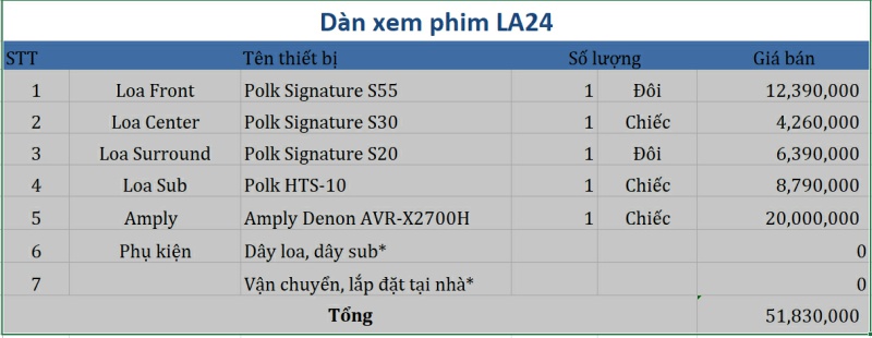 Thỏa sức thưởng thức những thước phim bom tấn tại nhà với bộ dàn xem phim 5.1 LA21 của Điện tử Linh Anh. Được xây dựng từ các thiết bị âm thanh chính hãng chất lượng đến từ các thương hiệu nổi tiếng thế giới như Denon , Polk Audio, nộ dàn xem phim 5.1 LA21 hứa hẹn sẽ đem đến cho bạn những phút giây thư giãn bên gia đình với những bộ phim bom tấn có chất lượng âm thanh đỉnh cao như tại rạp chiếu phim chuyên nghiệp.