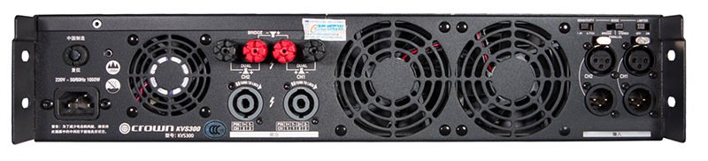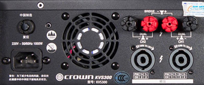 Đầu vào của cục đẩy Crown KVS 300 là loại XLR cân bằng điện tử. Đầu ra loa có 2 loại là: Cọc loa dạng Touch-proof và Speakon (Neutrik)
