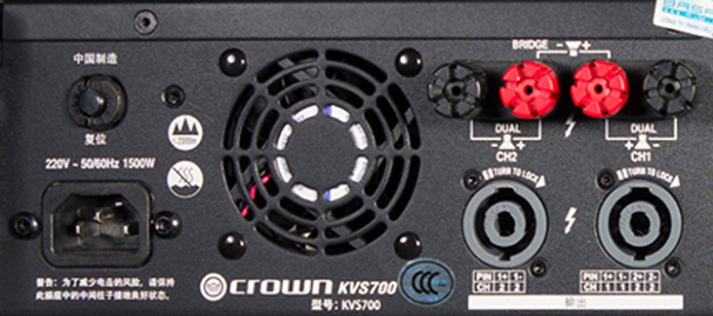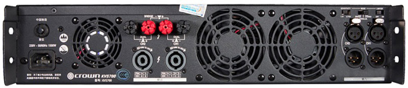 Đầu vào của cục đẩy Crown KVS 700 là loại XLR cân bằng điện tử. Đầu ra loa có 2 loại là: Cọc loa dạng Touch-proof và Speakon (Neutrik)