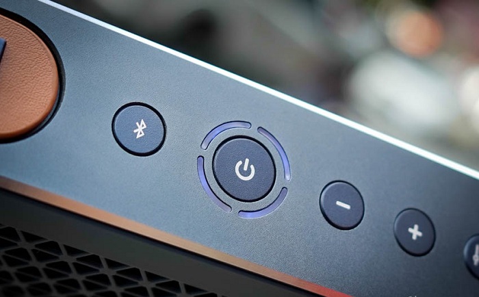 Các phím bấm điều khiển khá đơn giản và nằm hết trên đỉnh loa, phím nguồn bao quanh bởi 4 đèn LED khi bật lên có màu xanh chạy vòng rất đẹp mắt, phím bluetooth để kết nối và ghép thiết bị, phím tăng giảm âm lượng và phím chuyển đổi giữa hai chế độ âm thanh Clear và Warm nhằm phù hợp với các nhu cầu thưởng thức nhạc khác nhau.