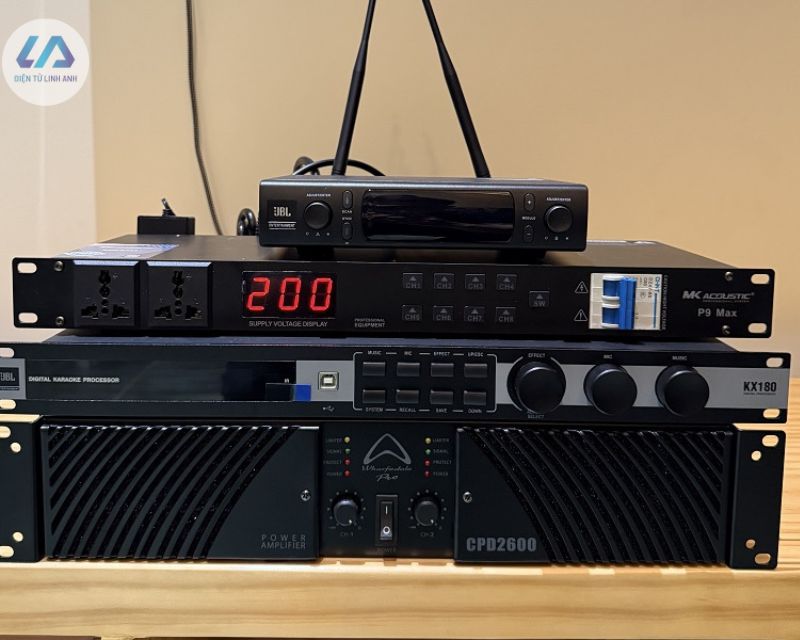 Vang số JBL KX180A: Bộ xử lý âm thanh nổi tiếng với khả năng cân chỉnh chuyên sâu, cho giọng hát mượt mà, hạn chế hú rít và tăng độ chi tiết cho nhạc nền.