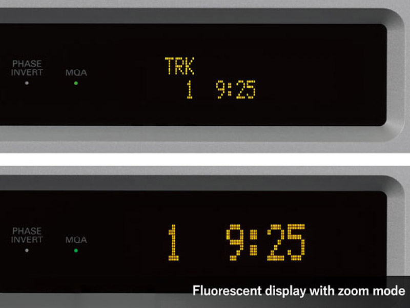 Chế độ hiển thị phóng to của được tích hợp trên Luxman D-03X giúp màn hình huỳnh quang dễ nhìn từ xa. Ngoài ra, đèn LED nhiều màu biểu thị trạng thái giải mã MQA (màu xanh dương cho Studio, màu xanh lục cho Authentic và màu tím / đỏ cho Trình kết xuất).