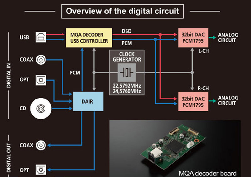 Với 2 chip PCM1795 của Texas Instruments: cấu hình theo cấu trúc mono DAC giúp giảm nhiễu chéo, tăng cường độ chi tiết. Chip DAC này hỗ trợ giải mã tín hiệu từ đĩa CD/ SACD cũng như những tín hiệu digital từ các cổng S/PDIF và USB, với độ phân giải PCM cao nhất lên đến 384kHz/32bit và DSD 11.2MHz.