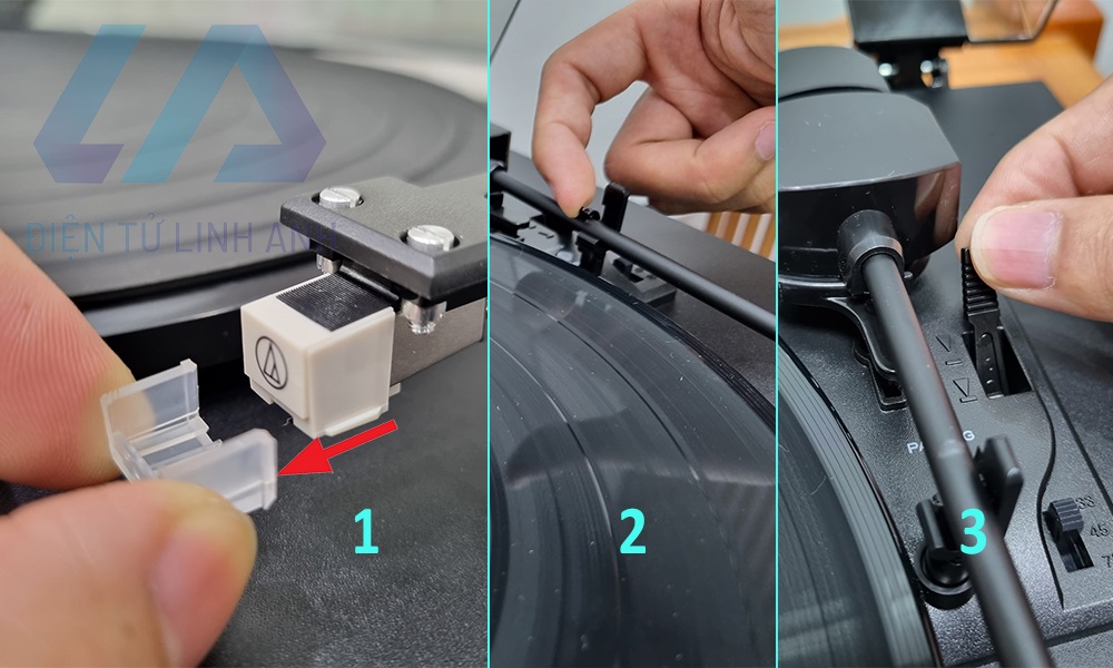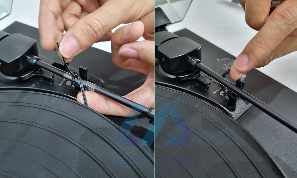 - Đầu kim than là một bộ phận rất nhạy cảm, rất dễ cong gãy, nên các bạn cần lưu ý sử dụng đúng các thao tác như hướng dẫn trên. Sau khi không dùng nữa nên nhớ khóa cần lại và đậy nắp bảo vệ đầu kim than như ban đầu.