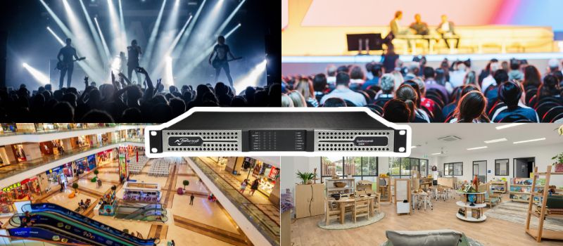 Với những công trình có diện tích lớn như trung tâm thương mại, nhà thi đấu hay sân vận động, thiết bị vẫn đủ mạnh để kéo những hệ thống loa công suất cao, đồng thời dễ dàng tích hợp với mạng âm thanh lớn nhờ khả năng điều khiển từ xa.