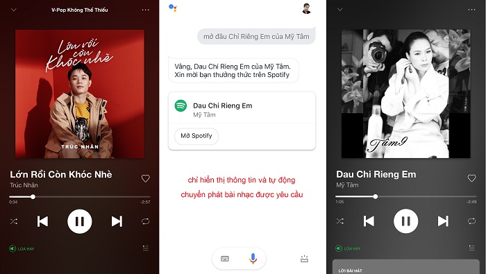 Khi HEOS đang phát nhạc từ Spotify, bạn mở ứng dụng Google Assistant, nhấn chọn icon Micro hoặc nói " Ok Google" / "Hey Google" là bạn có thể bắt đầu ra khẩu lệnh yêu cầu mở bất kỳ 1 bài hát ( bản nhạc ) nào. Google Assistant sẽ tự động truy vấn và thực hiện liên kết với Spotify để phát nhạc. Lưu ý trong khẩu lệnh yêu cầu tìm kiếm nên nói bài hát (bản nhạc) đó của ai để tăng độ chính xác của từ khóa. Lúc này, các yêu cầu tắt tiếng, bật tiếng, tăng/giảm volume, dừng/tiếp tục phát nhạc, phát bài nhạc tiếp theo cũng được thực hiện rất dễ dàng.