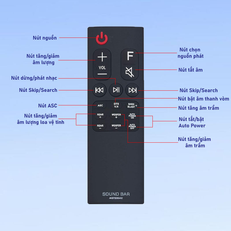 Một chiếc điều khiển loa LG thường sẽ bao gồm các chức năng sau: nút bật/tắt (nút nguồn), nút F để chọn nguồn phát âm thanh, nút dừng/phát nhạc, nút tăng/giảm âm lượng,...