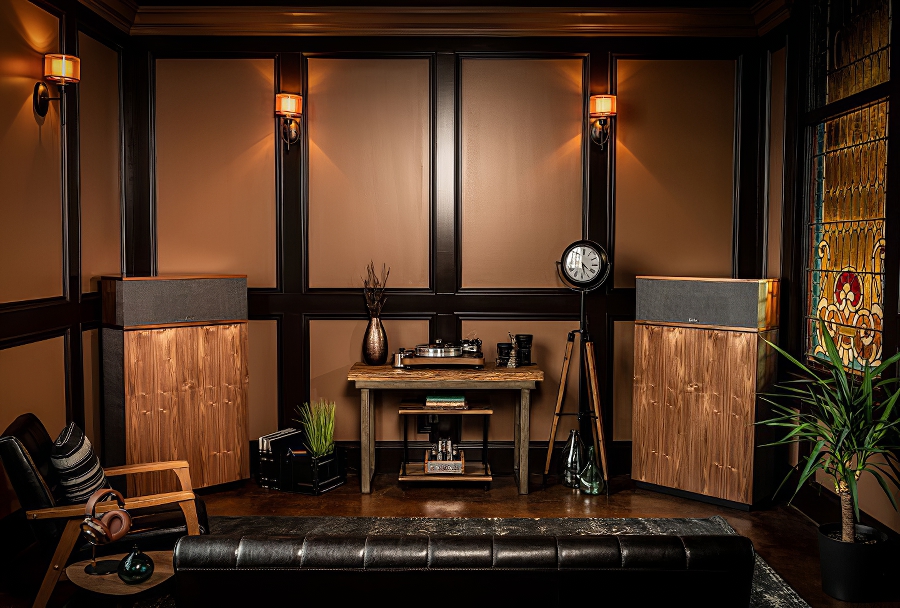 Trên đỉnh là khối thùng chứa cả 2 củ loa Treble và Mid họng kèn Tractrix Horn.