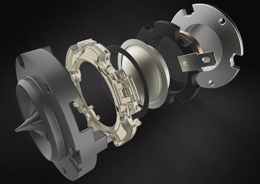 Loa Treble màng Aluminum cứng nhẹ đường kính 2,54cm giúp dải cao đạt tới 21kHz với hiệu suất vượt trội so với các thiết kế loa Treble polime và lụa thông thường. Cấu trúc vòng treo định âm Linear Travel Suspension (LTS) bằng hợp chất Kapton cứng nhẹ chịu nhiệt giúp âm thanh tần số cao có độ bao phủ và phân tán rộng, hoạt động ổn định và không có hiện tượng méo tiếng ngay cả khi người dùng mở âm lượng lớn.