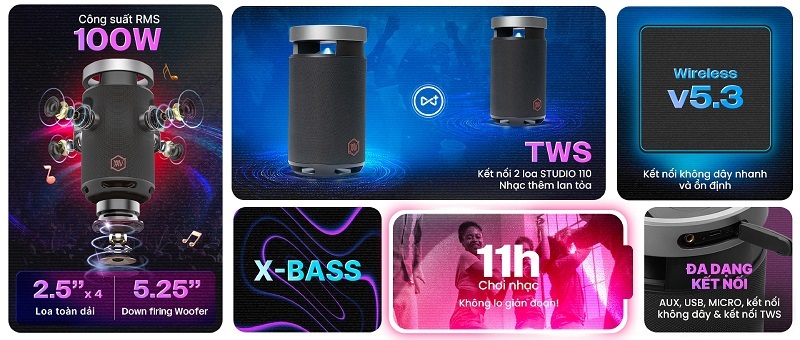 Trang bị viên pin 21.000mAh, STUDIO 110 cho thời gian phát nhạc lên đến 11 giờ ở mức âm lượng 50%. Đây là con số ấn tượng đối với một chiếc loa loa tiệc nhỏ, giúp bạn yên tâm “chill xuyên đêm” mà không lo gián đoạn.