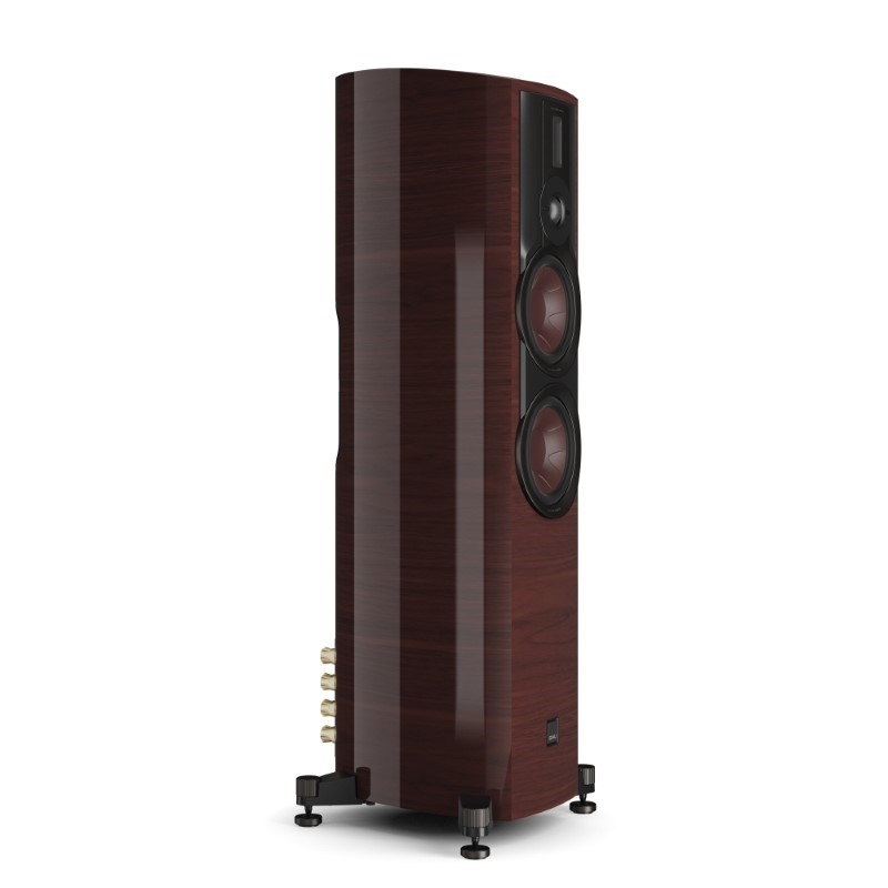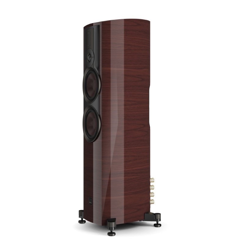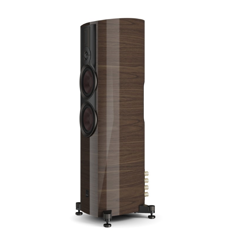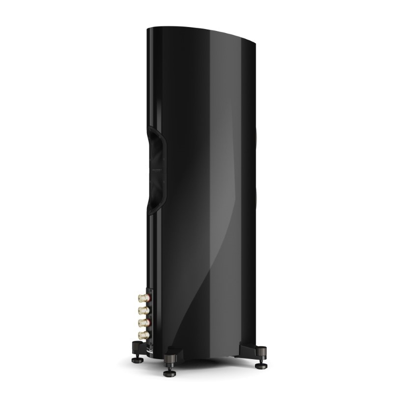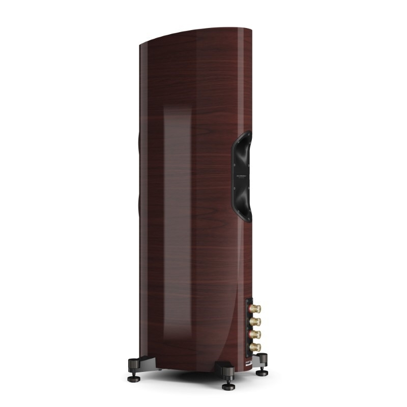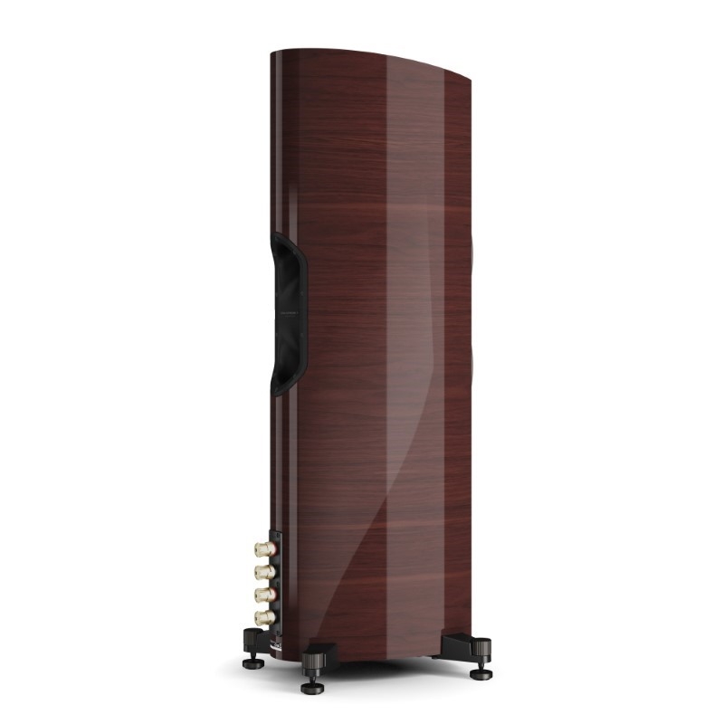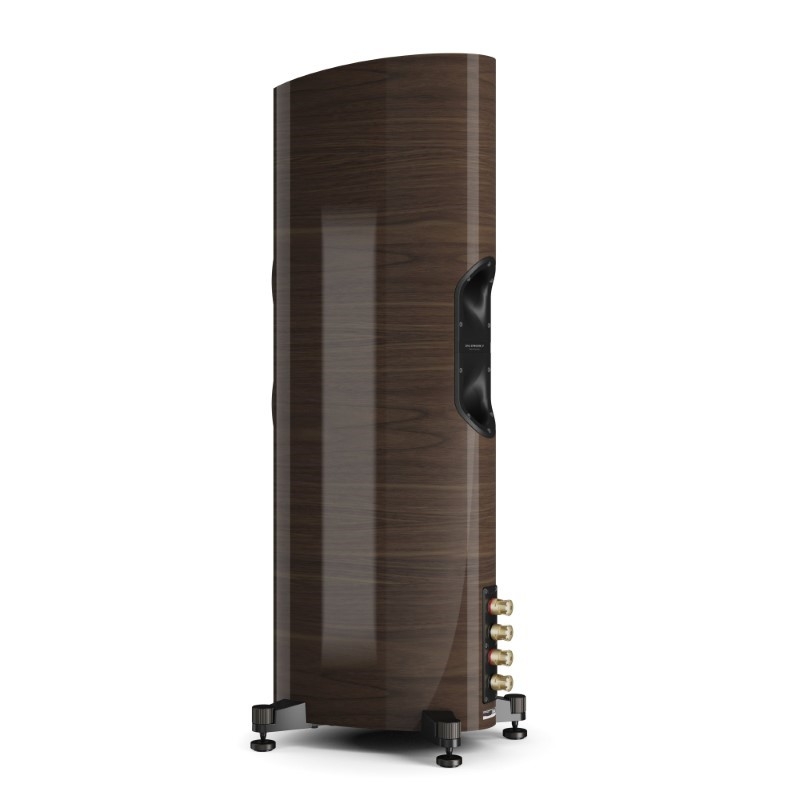 Trên thùng loa, những đường cong mềm mại không chỉ tạo điểm nhấn thẩm mỹ mà còn nhằm hạn chế cộng hưởng nội tại, đồng thời tăng độ ổn định về mặt âm học.