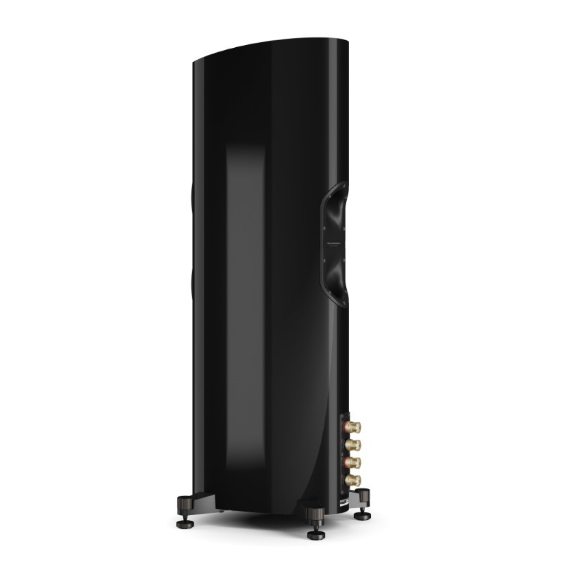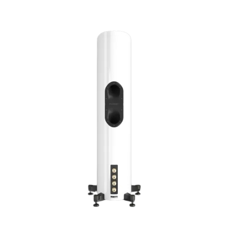 Tại mặt sau, loa bố trí hệ thống bass reflex với thiết kế loe liên tục giúp tối ưu luồng không khí bên trong thùng loa, giảm thiểu nhiễu và hiện tượng ù nền.
