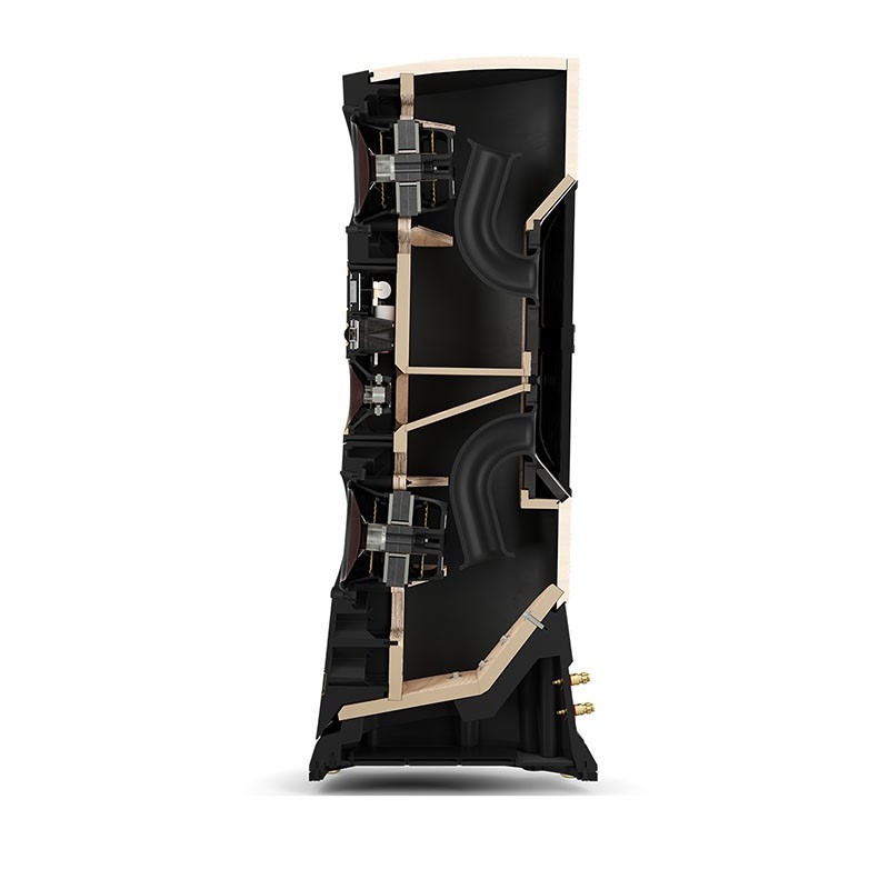 Thùng loa được chế tạo từ cấu trúc laminate ép định hình kết hợp hệ thống gia cố chắc chắn bên trong, giúp tăng độ cứng và triệt tiêu rung chấn. Các khoang riêng biệt, baffle cố định và hệ thống cổng bass dual-flare được tối ưu nhằm giảm nhiễu và hạn chế tối đa hiện tượng méo màu.