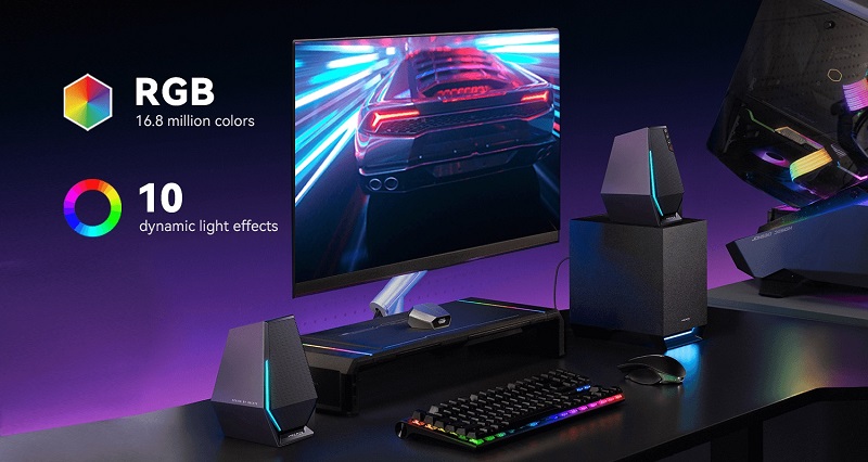 Nổi bật nhất chính là hiệu ứng ánh sáng động lên tới 16,8 triệu RGB được tích hợp đồng bộ trên cả 3 loa. Ánh sáng đa sắc rực rỡ có thể nhấp nháy theo nhịp điệu âm nhạc giúp không gian trở nên huyền ảo và lôi cuốn hơn. Bạn có thể tùy chỉnh màu sắc và hiệu ứng ánh sáng theo sở thích cá nhân.
