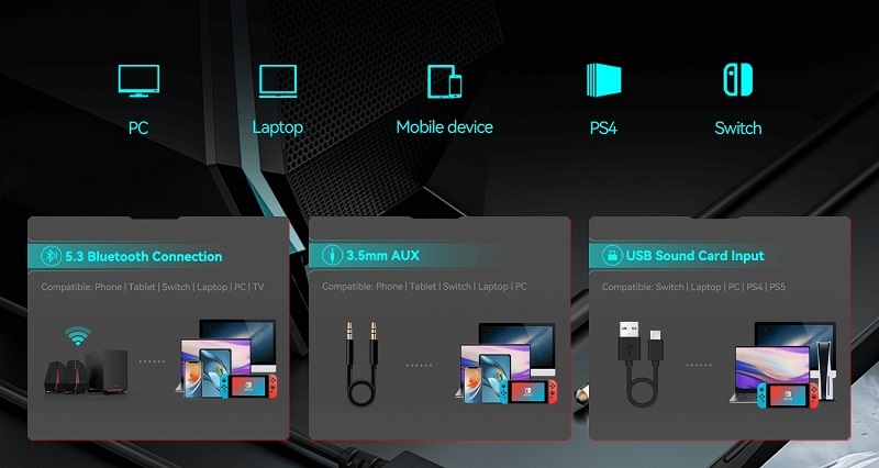 Ngoài ra, loa hỗ trợ soundcard USB và đầu vào AUX để kết nối với nhiều thiết bị khác nữa. Và nhờ cáp chuyển đổi USB-C sang USB-A, việc chuyển đổi giữa các cổng kết nối sẽ trở nên dễ dàng hơn.