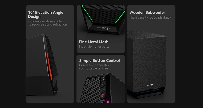 Loa Edifier Hecate G1500Max có phong cách thiết kế đậm chất gaming cực kỳ ấn tượng. Bộ loa gồm 1 loa siêu trầm và 2 loa L/R. Hình thức bên ngoài được hoàn thiện với những đường cắt gọt mạnh mẽ, sắc nét tạo cảm giác mạnh mẽ, chắc chắn.