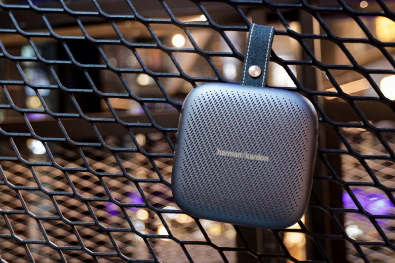 Khác với JBL luôn có xu hướng chọn màu sắc sặc sỡ trên các sản phẩm. Harman Kardon Neo có vẻ ngoài sang trọng với tông màu xám đen, vàng và xanh biển. Thiết bị cũng đi kèm dây móc da cao cấp và khả năng cầm nắm nhẹ nhàng nhờ thiết kế bo cong của mình.