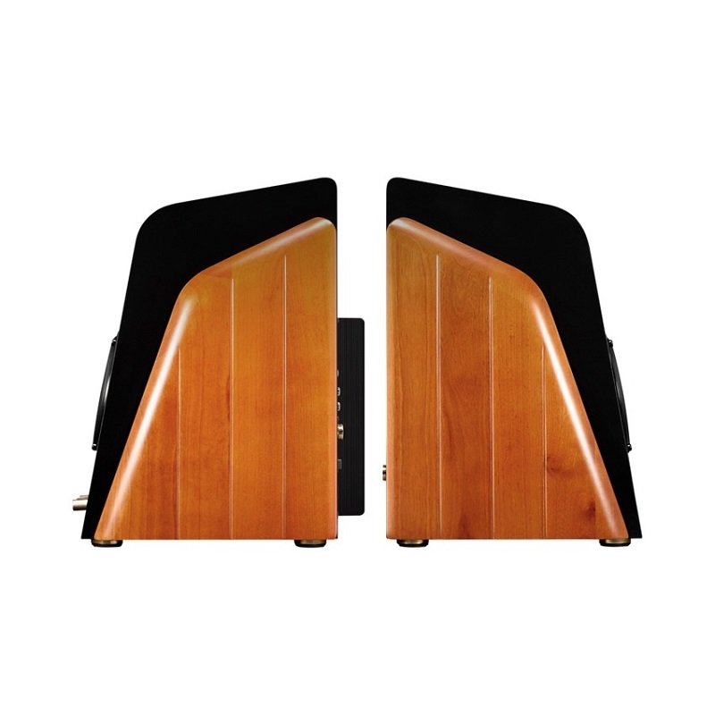 Mặt ngoài của loa được phủ màu đen nhám, kết hợp với hai bên hông loa được ốp tấm gỗ thật màu nâu được mài bóng tinh xảo, tạo nên điểm nhấn cao cấp và độc đáo. Đây cũng là điểm đặc biệt làm nên ngôn ngữ thiết kế riêng của dòng bookshelf-M từ Hivi Swan.