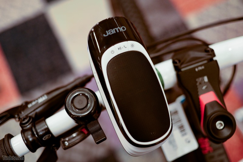 Jamo DS 1 có màu sắc nổi bật, bên dưới loa là bộ kit để gắn loa trên ghi-đông xe đạp, phía trước loa là dải đèn led cực sáng (như đèn chiếu sáng cho xe đạp), mặt trên là 1 loa lớn với các nút điều khiển ( on/ off - nhận cuộc gọi/play - đèn led).