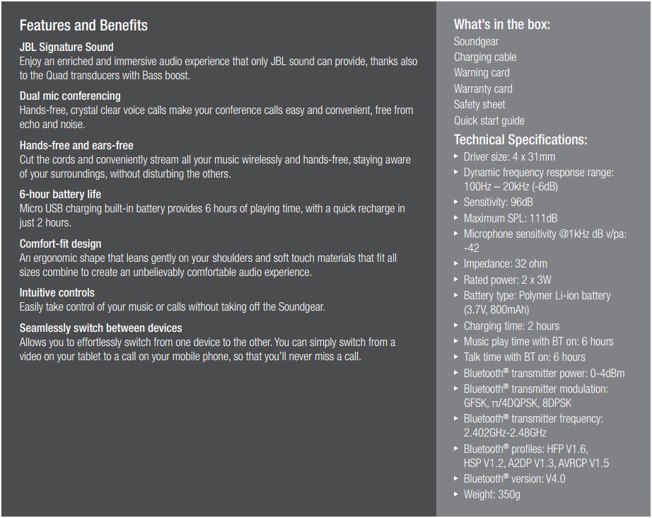 Hãng JBL mới đây đã giới thiệu một mẫu loa mới, mang tính đột phá công nghệ của năm 2017, loa hứa hẹn sẽ là xu hướng nghe nhạc, xem phim, giải trí tại gia trong thời gian sắp tới. Đúng như cái tên JBL đặt cho sản phẩm SoundGear Wearable ta có thể hình dung chiếc loa có thể đeo trên người, thuận tiện sử dụng khi di chuyển, hay đang làm việc, nhưng không chỉ có vậy, đặc điểm nổi bật nhất của sản phẩm là hiệu ứng âm thanh lập thể mà nó mang lại cho người sử dụng, đặc biệt khi xem phim hay chơi game, với hiệu ứng âm thanh ấn tượng và mới lạ này, SoundGear sẽ đưa bạn như đi vào thế giới ảo của những bộ phim hay những tựa game bom tấn.