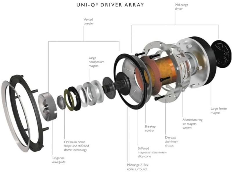 Đặc biệt với công nghệ củ loa Uni-Q “độc quyền” của hãng, sử dụng chất liệu từ tính mới neodymium/sắt/carbon để tạo ra sức mạnh hoàn toàn mới cho nam châm. Củ loa midrange kích thước 125mm có màng loa vòm được làm từ nhôm cứng chắc loại bỏ tốt hơn các hiện tượng vỡ tiếng.