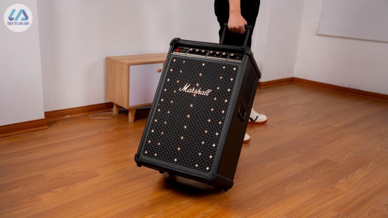 Vẫn là lớp vỏ bọc da vinyl kinh điển, lưới tản nhiệt bằng thép cứng cáp và logo Marshall màu đồng thau đầy kiêu hãnh. Nhưng lần này, tất cả được đặt trên một "thân hình" loa kéo mạnh mẽ, trang bị bánh xe và tay kéo tiện lợi, biến Bromley 750 thành một "tượng đài âm thanh" di động thực thụ.