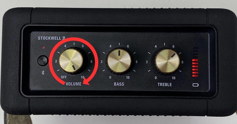 Loa Marshall Stockwell 2 không có nút nguồn riêng. Vì vậy để bật loa, bạn hãy vặn nút Volume xuôi chiều kim đồng hồ để khởi động loa. Để tắt loa, bạn chỉ cần vặn núm Volume ngược chiều kim đồng hồ cho đến khi nghe một tiếng tạch.