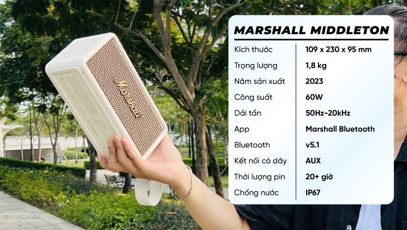 Middleton là mã loa di động thế hệ mới của Marshall ra mắt năm 2023. Thiết kế của Middleton gọn gàng, đẹp mắt, vẫn giữ phong cách vintage quen thuộc. Loa hoàn thiện với 2 phiên bản đen và trắng đều rất bắt mắt. Nhất là màu trắng được yêu thích hơn cả.