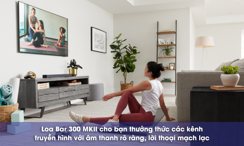 Loa thanh Bar 300MK2 cũng đem lại trải nghiệm xem truyền hình ấn tượng hơn hẳn loa TV nhờ công nghệ JBL PureVoice đem lại khả năng tái tạo giọng nói rõ nét vượt trội hơn.