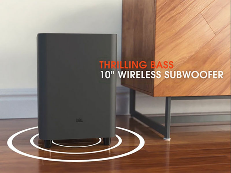 Dải trầm của hệ thống này được đảm nhiệm bởi 1 subwoofer wireless, trang bị củ loa đường kính 10 inch (254mm) cho tiếng bass sâu và đầy uy lực. JBL BAR 9.1 cũng được trang bị đầy đủ những kết nối không dây phổ biến như Google Chromecast, Apple AirPlay 2 và Bluetooth, cho phép truyền phát âm thanh không dây chất lượng cao từ các nguồn phát di động. Toàn bộ hệ thống loa soundbar này có tổng công suất lên tới 820W, cổng HDMI của loa hỗ trợ dữ