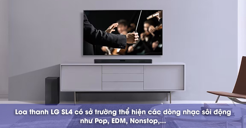 Loa thanh soundbar LG SL4 rất thích hợp để thể hiện tiết tấu nhanh và sống động của các dòng nhạc mạnh như EDM, Nonstop, Remix, Pop và Electro.