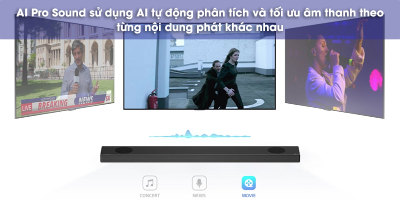 AI Sound Pro tự động phân tích và tối ưu âm thanh trong thời gian thực. Không cần phải mất công điều chỉnh, soundbar sẽ tự động điều chỉnh âm thanh sao cho phù hợp nhất với nội dung đang phát.