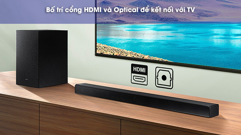 Không quá phức tạp và chỉ mất vài phút để kết nối thành công loa soundbar Samsung với Tv. 2 phương tiện được cung cấp là cổng HDMI và Optical. Trong đó HDMI ARC là đường truyền chuyên biệt cho chất lượng âm thanh tốt nhất, không trễ, không nhiễu...