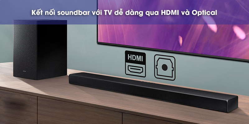 Trong đó, nếu muốn kết nối với TV, bạn nên chọn cổng HDMI hoặc Optical tùy theo các cổng hiện có trên TV nhà bạn. Ngoài ra có thể sử dụng Bluetooth để kết nối với các dòng TV Samsung tương thích.