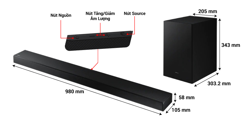 Riêng với loa thanh, kích thước chiều dài chỉ 98cm và bề dày 58cm. Bởi vậy, nếu bạn lắp A650 với TV thì những dòng sản phẩm từ 49 inch trở lên là sự lựa chọn hợp lý nhất. Khi đó tổng thể không gian sẽ có sự cân bằng và hài hòa.