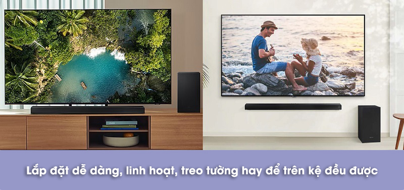 Cả loa thanh cũng có kết cấu khá gọn gàng, bởi vậy việc lắp đặt trở nên dễ dàng và thuận tiện hơn. Thông thường, loa thanh được lắp theo 2 cách phổ biến nhất là để trực tiếp trên kệ hoặc treo tường. Bạn có thể dựa theo cấu trúc không gian để bày bố cho hợp lý.