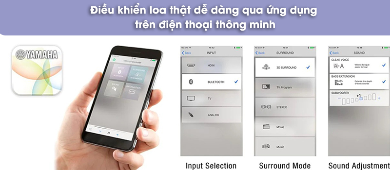 Ứng dụng "Home Theater Controller" miễn phí dành cho điện thoại thông minh giúp bạn điều khiển soundbar YAS-108 một cách dễ dàng và tiện lợi. Với giao diện trực quan, dễ hiểu, bạn có thể dễ dàng tinh chỉnh các cài đặt âm thanh của soundbar, bao gồm: