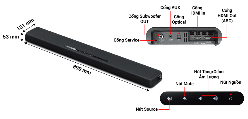 Dù chỉ có giá hơn 4 triệu đồng, Yamaha YAS-108 vẫn được trang bị đầy đủ các cổng kết nối như trên các dòng loa cao cấp, bao gồm: cổng Optical, 2 cổng HDMI (1 cổng IN và 1 cổng ARC), và cổng AUX 3.5mm. Điều này giúp loa có thể kết nối với nhiều nguồn âm thanh khác nhau, từ TV, đầu phát Blu-ray, máy chơi game, đến điện thoại, máy tính bảng,...