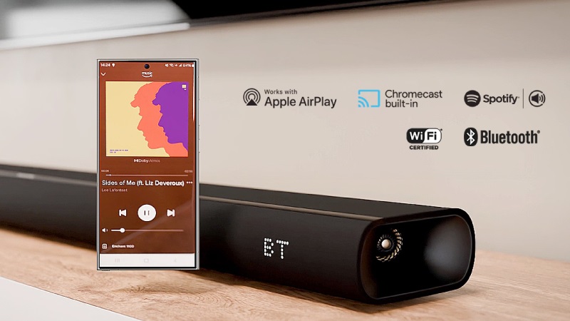 Kết nối với TV, bạn có thể dùng cổng HDMI hoặc Bluetooth, Wi-fi đều được. Tuy nhiên, kết nối có dây qua HDMI ARC sẽ cho tính ổn định và hiệu suất tốt hơn, cũng như chất lượng âm thanh tốt nhất với đầy đủ tín hiệu, bao gồm cả định dạng Dolby Atmos.