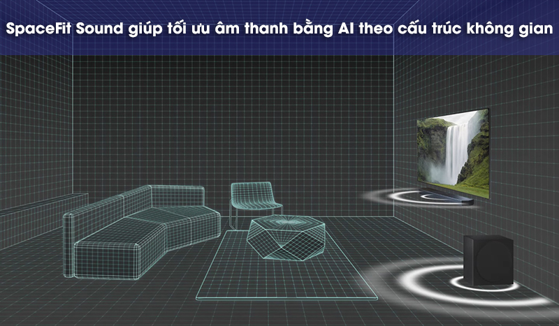 - SpaceFit Sound: Đây là công nghệ tự động tối ưu âm thanh bằng AI theo cấu trúc không gian. Sóng âm từ loa phát sẽ đo khoảng cách loa tới tường, TV, vị trí người ngồi, đồ đạc trong phòng,... Từ đó tiến hành điều chỉnh âm lượng, cường độ âm thanh, tần số loa,... để tạo ra không gian nghe lý tưởng nhất.