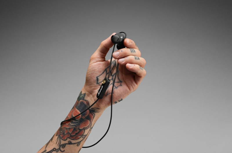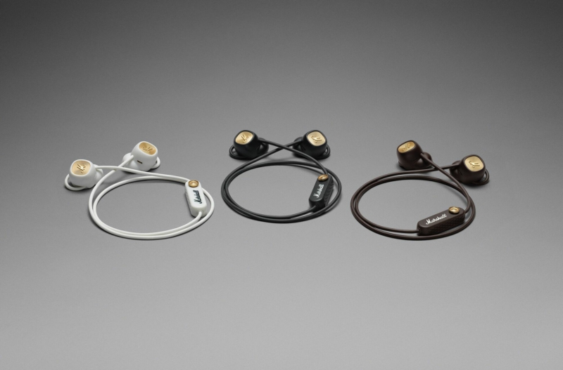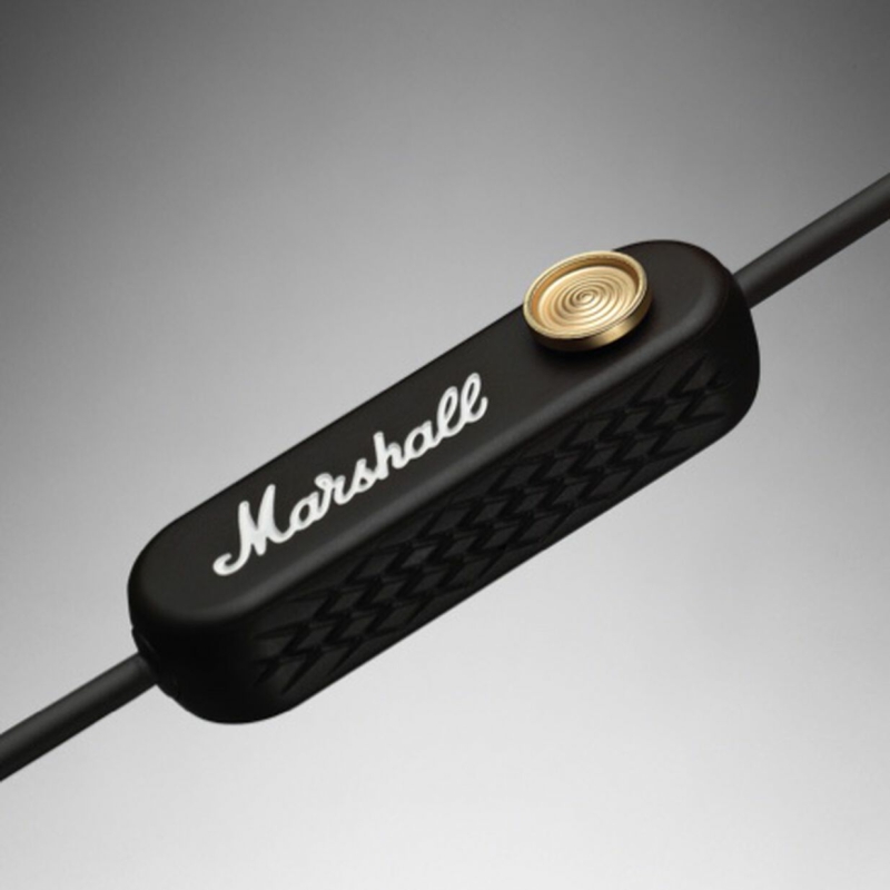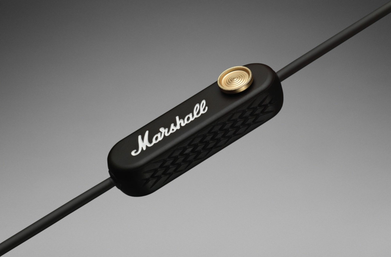 Có một mô-đun microphone (và pin) được “treo” ở phía bên phải của sợi dây kết nối. Cụm mô-đun này cũng tích hợp hệ thống điều khiển tăng, giảm âm lượng và tua qua bài hát bằng joystick của Marshall. Ngoài ra, nó cũng có tính năng tự động dừng mới: khi hai bên tai nghe được hít lại với nhau bằng nam châm, bài hát đang phát sẽ tạm dừng phát.