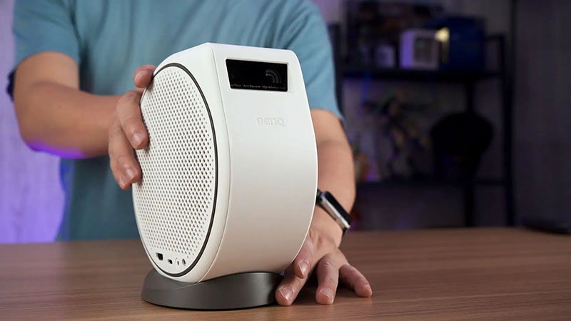 Gây ấn tượng mạnh ngay từ cái nhìn đầu tiên, BenQ GV30 tựa như chiếc loa thông minh hình đĩa, nhưng thực chất, đây là một chiếc máy chiếu mini có thiết kế trang nhã với kiểu dáng hình tròn trông tựa như một chiếc bánh xe 7 inch, ống kính được gắn sẵn ở vị trí lồi ra trên máy chiếu.